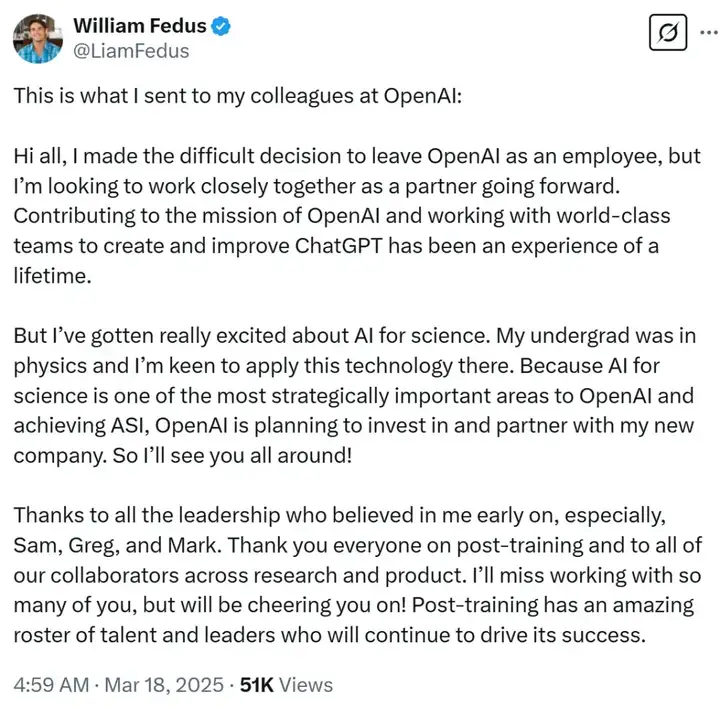 In the spring of 2025, a shocking resignation announcement was released:Liam Fedus, who previously served as VP of Research at OpenAI and was in charge of post-training, has decided to leave.In a tweet, he wrote that he has "the most strategic interest" in "the application of AI in science"—that is the direction in which he will explore new horizons.
