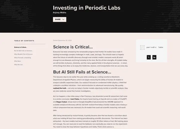 Periodic Labs claims to be building an "AI-driven science platform."Its vision is to enable artificial intelligence not only to analyze data, but also to design experiments, drive physical instruments, and discover new materials.