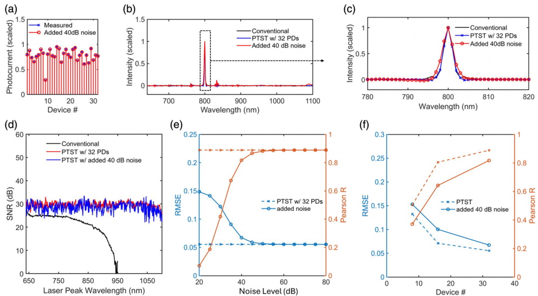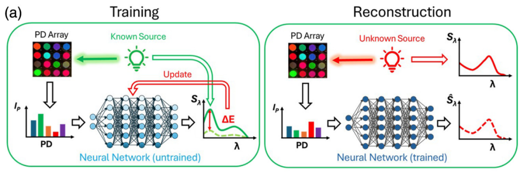 To address this problem,A research team from the University of California has proposed an innovative solution.A special photon trapping texture structure (PTST) was designed on the surface of a standard silicon photodiode, and a highly noise-resistant fully connected neural network was introduced. This network can intelligently calculate and reconstruct the original spectrum directly from the photocurrent signal measured by the device.This method not only enables the spectrometer to achieve a higher signal-to-noise ratio at longer wavelengths, but its overall performance also surpasses that of traditional silicon-based spectrometers.This marks a key step forward in AI-enhanced spectral sensing, enabling compact hardware to achieve the high spectral fidelity previously only attainable by large systems.