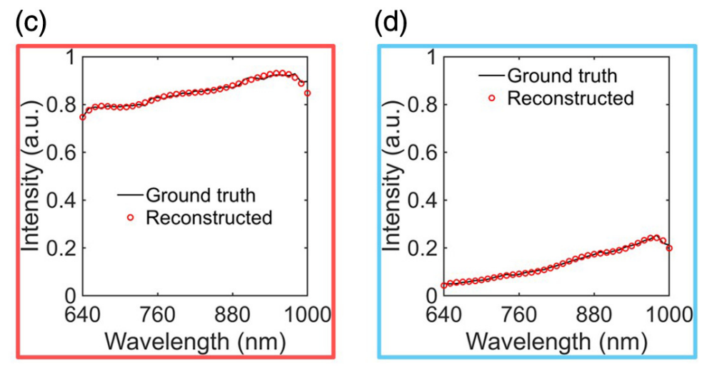 The network training phase used a synthetic dataset containing over 500,000 Gaussian spectra with varying peak values and widths, and model performance was evaluated using independent validation sets. As shown in the figure below, researchers found that the hyperspectral images reconstructed based on the experimental spectral responses of 16 photodiodes in the 640-1100 nm near-infrared band were visually highly consistent with the ground truth.