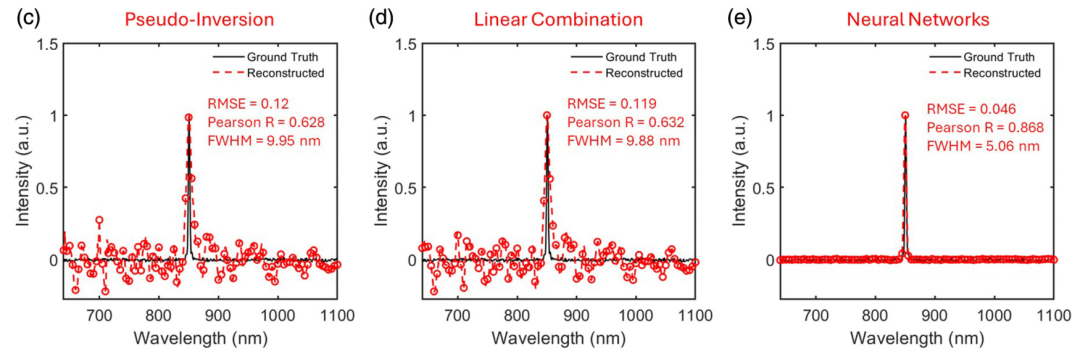 To verify the performance of this neural network, the researchers compared it with two traditional reconstruction methods. As shown in the figure below, the simple pseudo-inversion method and the method of linear combination of basis functions (such as Gaussian or sine functions) for the spectrum both performed poorly in reconstructing narrow linewidth laser spectra, with an RMSE of approximately 0.12 and a correlation coefficient R of approximately 0.63.
