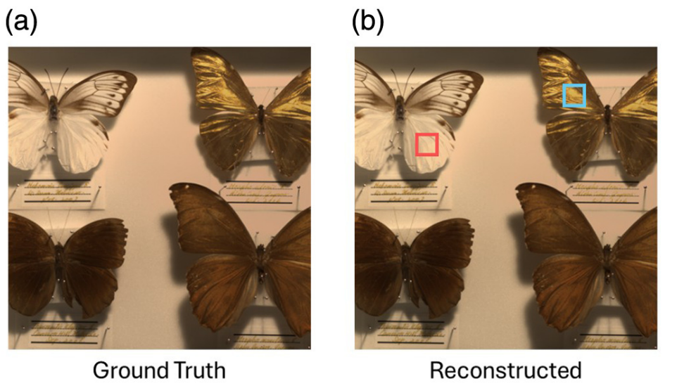Pseudo-color ground truth images and reconstructed hyperspectral images from the butterfly dataset