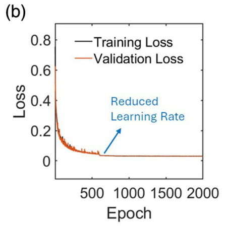 For the training strategy, the researchers used the Adam optimizer implemented based on the PyTorch framework. After testing various loss functions, a custom combined loss function that combines the root mean square error (RMSE) and the Pearson correlation coefficient (R) was ultimately selected. This function proved to be particularly effective in reconstructing narrowband spectra with sharp peaks. Specifically, the training batch size was set to 32, and the learning rate was 0.001.The researchers trained the model for 1,000 epochs and then reduced the learning rate to 0.0001 after the 600th epoch to promote better model convergence.To prevent overfitting, early stopping was used during training. As shown in the figure below, both training and validation losses decreased rapidly and eventually converged, indicating that the model learned well and had strong generalization ability.