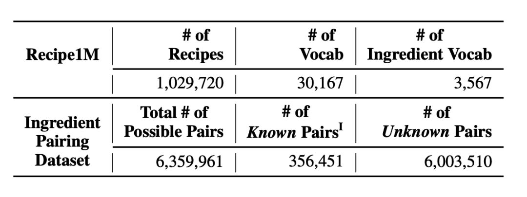 From these recipes, we filtered out the food through word vector extraction and other techniques, and then performed pairing operations.A total of 356,451 valid known combinations were obtained, and the remaining 6,003,500 food pairs were unusual or had never appeared before and were used as test sets..
