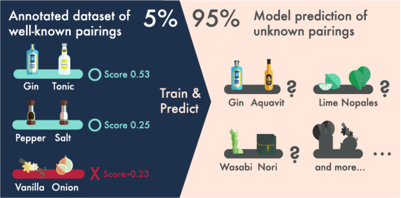 After building the model,First, let the model learn the labeled food combinations, analyze and find the rules of "good combinations" from the 300,000 already scored pairs, and then use the remaining 95% food combinations for the final test..