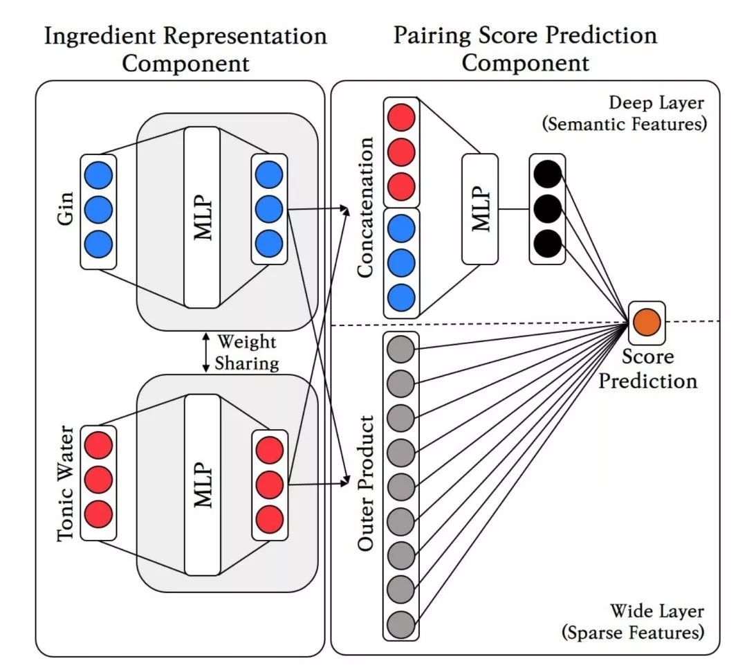 The second component is 「Pairing Score Prediction Component,Deep& Wide Layers are used for the scoring process.,In the Deep Layer, the two layers of learned representation vectors are,concatenated and passed to another MLP that computes the joint representation,of the two components to extract semantic features, while the Wide Layer is used to,capture sparse features.