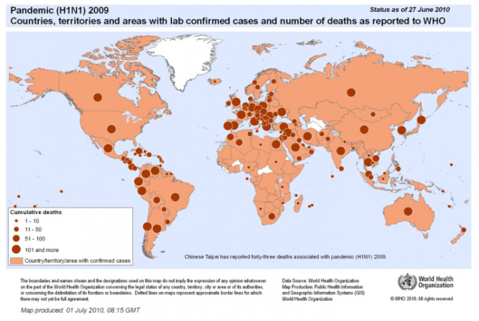 Countries and territories reporting laboratory-confirmed H1N1 cases and deaths in 2009 by WHO