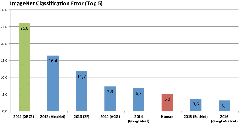 The error rate of image classification in the ImageNet Challenge has been decreasing year by year and has exceeded that of humans (5.0)