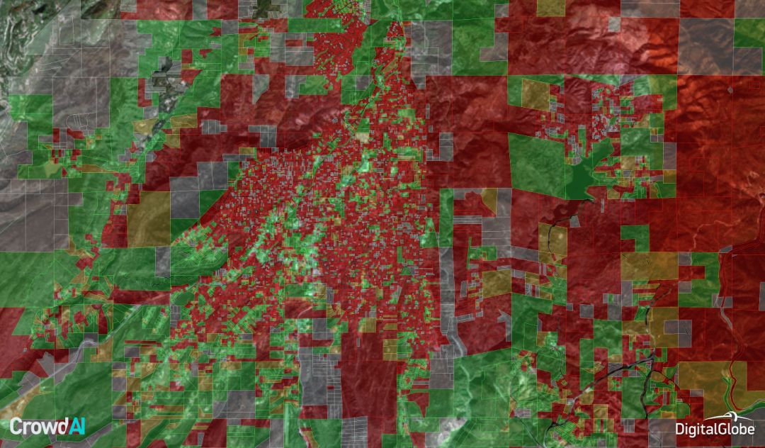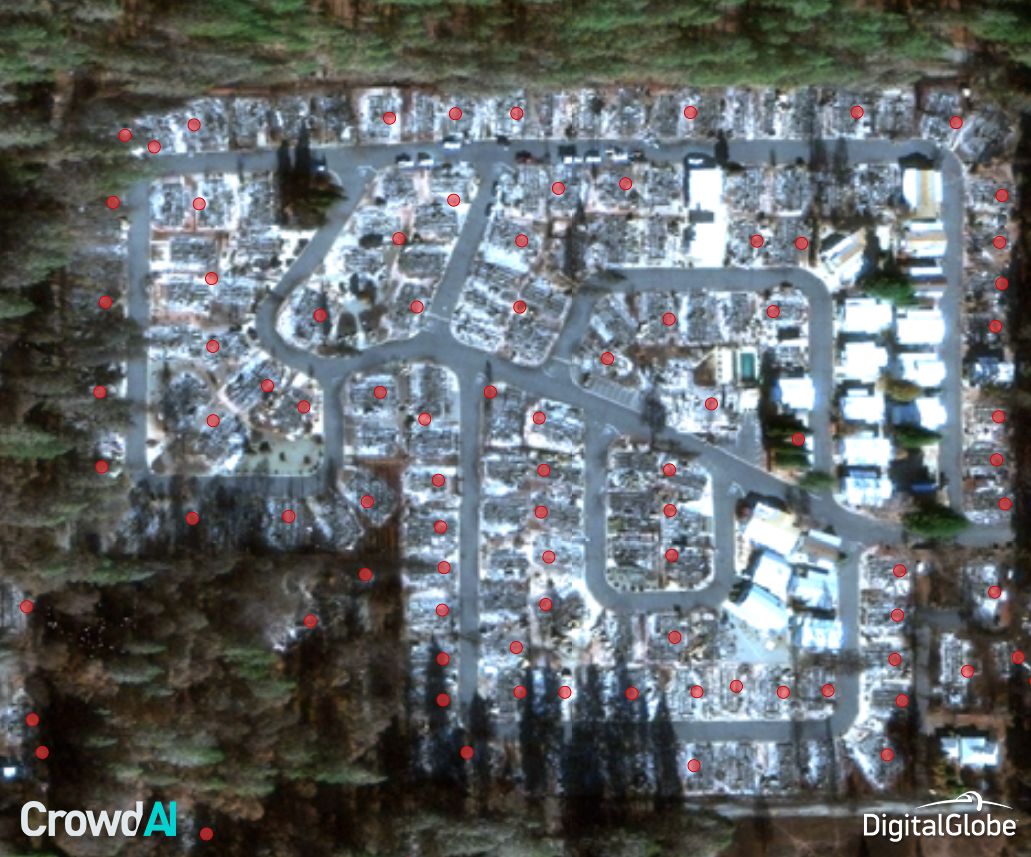 In that fire, after identifying the structure from satellite imagery, the AI model marked the location of the damage with red dots based on a comparison of images before and after the disaster.