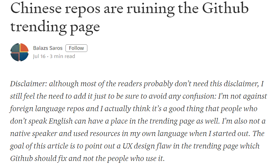 An article titled "Chinese developers' repos are dominating GitHub"
