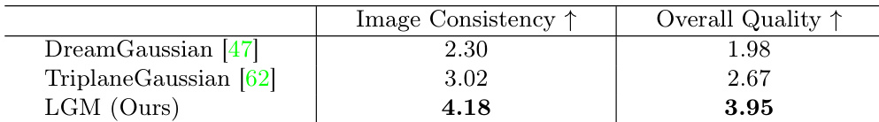 Results show that the proposed method, LGM, achieves the highest ratings in both image consistency and overall quality compared to DreamGaussian and TriplaneGaussian. The authors use a user study to evaluate the generated 3D Gaussians, where LGM outperforms the baselines, demonstrating superior alignment with the input image content and better overall model quality.