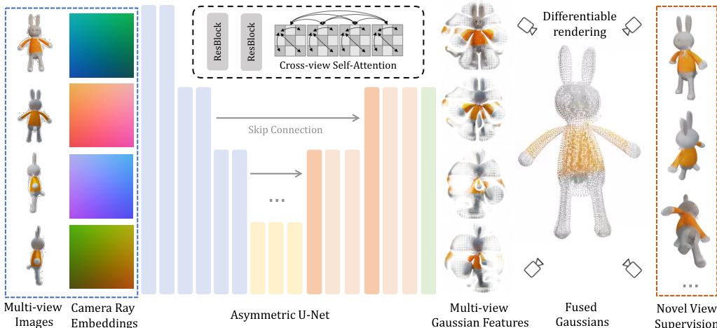 The central component of the framework is an asymmetric U-Net architecture, as shown in the detailed architecture diagram. This network takes four input images and their corresponding camera ray embeddings as input. The RGB values and ray embeddings are concatenated to form a 9-channel feature map for each pixel, which is then processed through the U-Net. The architecture incorporates residual layers and self-attention mechanisms, with self-attention applied at deeper layers to reduce memory consumption. To enable cross-view information propagation, the features from the four input views are flattened and concatenated before self-attention is applied. The output of the U-Net is a feature map with 14 channels, which is interpreted as the parameters of 3D Gaussians. The network is designed to be asymmetric, with a lower output resolution than the input, allowing for higher-resolution inputs while limiting the number of output Gaussians. The predicted Gaussian parameters, including position, scale, rotation, opacity, and color, are fused across the four views to form the final 3D Gaussian representation.