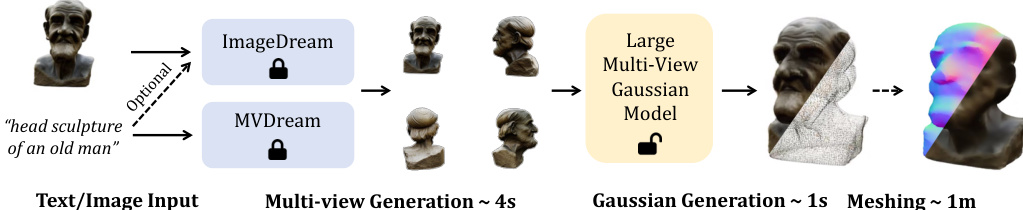The authors leverage a two-step pipeline for high-resolution 3D content generation, beginning with the synthesis of multi-view images from text or image inputs using off-the-shelf models. Specifically, MVDream is employed for text-to-multi-view generation, while ImageDream handles image (and optionally text) inputs, both producing four orthogonally oriented views at a fixed elevation. These multi-view images serve as input to a core U-Net-based model designed to predict and fuse 3D Gaussians. The overall framework is illustrated in the pipeline diagram, where the initial multi-view generation step is followed by Gaussian generation and optional mesh extraction.