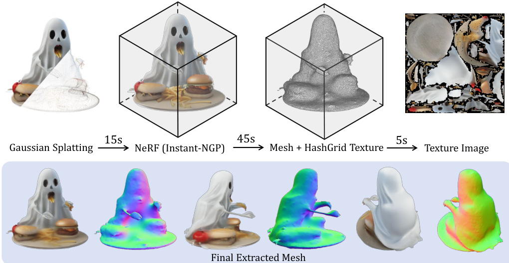 • Meshing: Our meshing method produces smoother surfaces than DreamGaussian [47], independent of underlying Gaussians, and is advantageous for relighting.