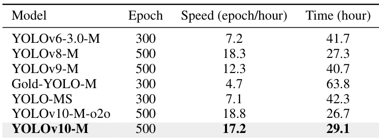 The authors compare the training efficiency of YOLOv10-M with other YOLO variants, showing that YOLOv10-M achieves a high training throughput of 17.2 epochs per hour, resulting in a total training time of 29.1 hours on 8 NVIDIA 3090 GPUs. This demonstrates that despite using 500 training epochs, YOLOv10 maintains an affordable training cost compared to other models.