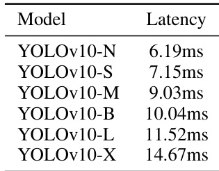 The authors present latency results for YOLOv10 models across different scales, showing that larger models have higher inference latencies. YOLOv10-N achieves the lowest latency at 6.19ms, while YOLOv10-X has the highest at 14.67ms, reflecting a clear trend of increasing latency with model size.