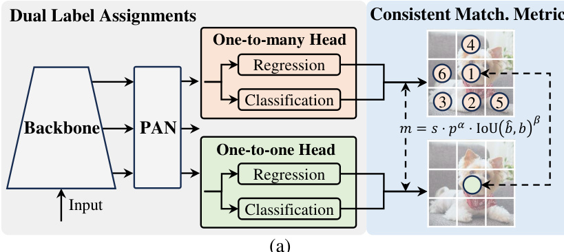 The authors leverage a dual-head architecture to enable NMS-free training in YOLO models, addressing the trade-off between inference efficiency and performance. The framework, illustrated in the diagram below, consists of a shared backbone and a PAN (Path Aggregation Network) neck, which feed into two parallel detection heads. The first is a one-to-many head, which provides rich supervisory signals during training by assigning multiple positive predictions to each ground truth instance. The second is a one-to-one head, which assigns only a single prediction per ground truth, thereby eliminating the need for NMS post-processing during inference. Both heads share the same underlying network structure and optimization objectives, but they utilize different label assignment strategies. During training, the model is jointly optimized with both heads, allowing the backbone and neck to benefit from the abundant supervision of the one-to-many branch. During inference, the one-to-many head is discarded, and predictions are made solely by the one-to-one head, enabling end-to-end deployment without additional computational cost. This design ensures that the model can achieve high accuracy during training while maintaining high inference efficiency.