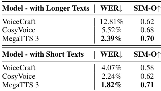 The authors compare the performance of MegaTTS 3 with VoiceCraft and CosyVoice on longer and shorter text samples, using WER and SIM-O as evaluation metrics. Results show that MegaTTS 3 achieves the lowest WER and highest SIM-O scores in both conditions, demonstrating its superior speech intelligibility and speaker similarity, especially for longer texts.