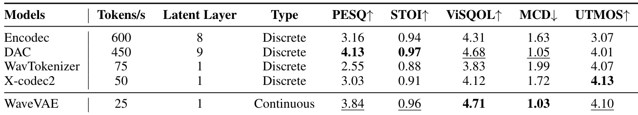 • WaveVAE, the proposed speech codec, achieves superior reconstruction quality (PESQ, ViSQOL, MCD) at high compression rates (25 tokens/s), and enables better zero-shot TTS performance than Encodec and DAC due to its compact latent space.