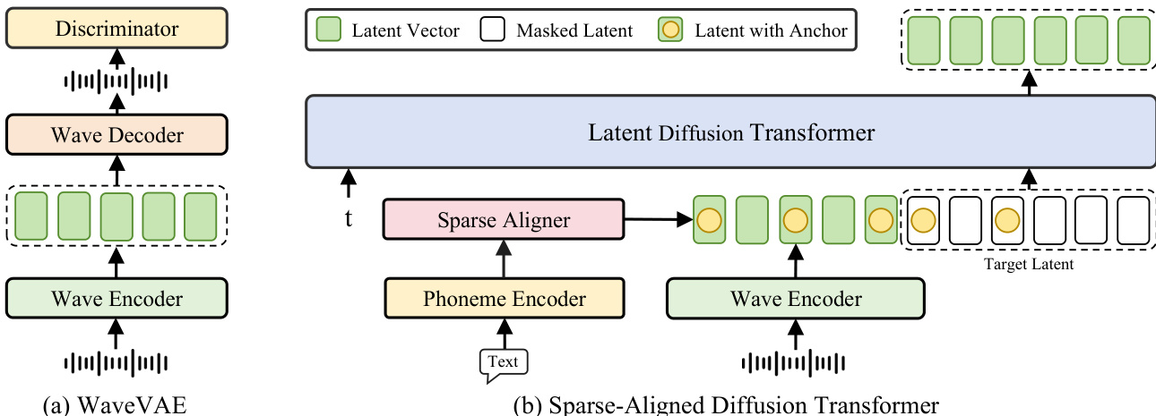 To enhance alignment learning, the model incorporates a sparse alignment strategy. This strategy provides a rough alignment path by retaining only one anchor token per phoneme in the phoneme sequence, which is then downsampled and concatenated with the latent sequence. This rough alignment simplifies the learning process while allowing the model to construct fine-grained implicit alignment paths through attention mechanisms. The sparse alignment information is fed into the latent diffusion transformer via a Sparse Aligner module, which processes the phoneme encoder output and the wave encoder output to generate the aligned latent sequence.