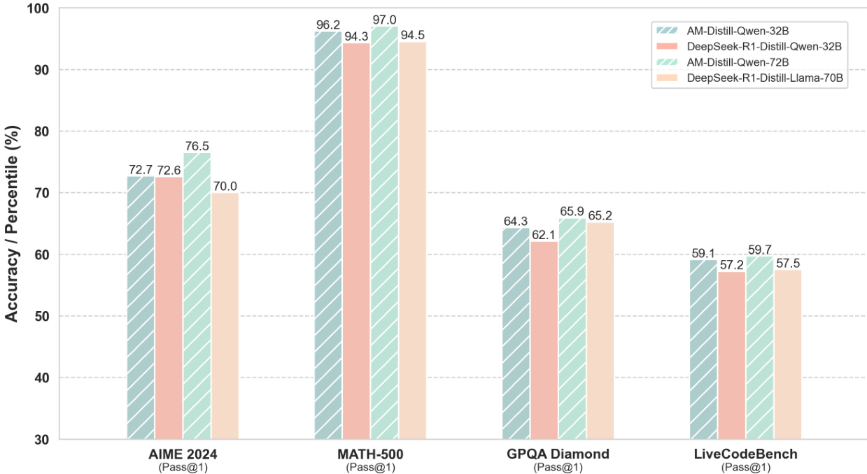 - AM-Distill-Qwen-72B outperformed DeepSeek-R1-Distill-Llama-70B: AIME2024 (76.5% vs. 70.0%), MATH-500 (97.0% vs. 94.5%), GPQA Diamond (65.9% vs. 65.2%), LiveCodeBench (59.7% vs. 57.5%).
