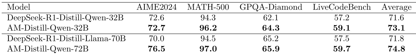 The authors use the AM-Distill-Qwen-32B model, trained on their AM-DeepSeek-R1-Distilled-1.4M dataset, to achieve improved performance over DeepSeek-R1-Distill-Qwen-32B across all benchmarks, with accuracy increases from 71.6% to 73.1% on average. Results show that the AM-Distill-Qwen-72B model further improves performance, achieving an average accuracy of 74.8%, outperforming DeepSeek-R1-Distill-Llama-70B on all evaluated tasks.
