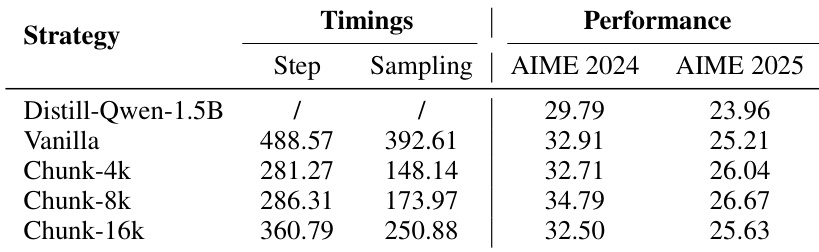 The authors use a chunk-wise rollout strategy to evaluate training efficiency, comparing it against a naive full-response generation approach. Results show that reducing the chunk size decreases sampling time per step, but further reduction from 8k to 4k tokens does not improve total training time due to increased log probability computations, indicating a trade-off between sampling speed and computational overhead.