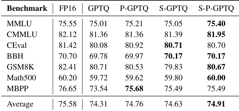 The authors use a chunk-wise rollout strategy to evaluate training efficiency, with results showing that reducing chunk size decreases sampling time per step but has minimal impact on total training time due to increased log probability computations. The S-P-GPTQ method achieves the highest average score of 74.91, outperforming other quantization methods across most benchmarks while maintaining competitive performance.