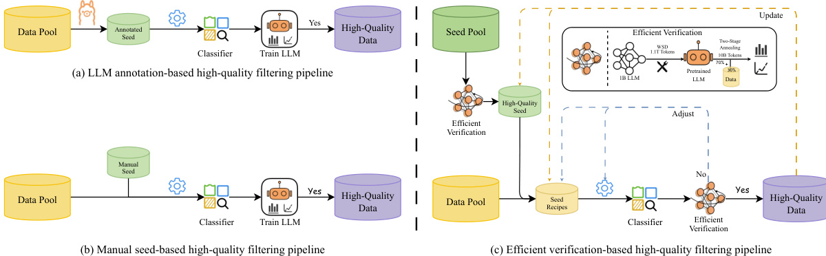 The training process for MiniCPM4 is designed for efficiency and effectiveness, utilizing a combination of advanced data filtering, pre-training strategies, and post-training techniques. A key component is the UltraClean data filtering and generation strategy, which ensures the quality of the training data. The authors propose an efficient verification-based filtering pipeline, as shown in the figure, which uses a pre-trained LLM to verify the quality of data generated from a seed pool. This approach is more efficient and accurate than traditional model-based filtering methods that rely on human expertise. The pre-training phase is optimized through the ModelTunnel v2 system, which allows for efficient strategy search on small models and transfer to large models, reducing the experimental cost. The pre-training objective is enhanced by adopting multi-token prediction (MTP), which provides denser supervision signals compared to traditional next-token prediction. This is implemented by adding additional prediction heads to the model, which predict multiple tokens ahead. The training infrastructure is optimized with an FP8 mixed-precision framework, which leverages the powerful FP8 computing capabilities of modern GPUs. This involves online block-wise FP8 quantization for both parameters and activations, with FP8 used for linear projections in the forward and backward passes, while gradients are computed in BF16 to maintain stability.