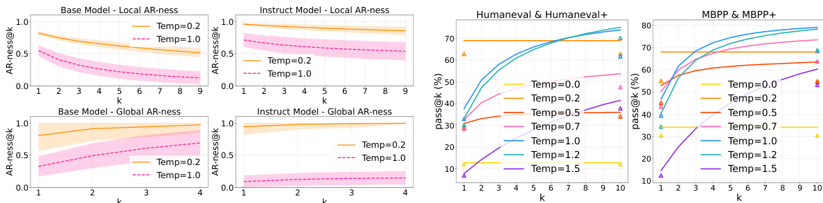 Results show that higher sampling temperatures reduce AR-ness in both base and instruct models, indicating a shift toward less sequential and more parallel token generation. This decrease in AR-ness correlates with improved generation diversity, as evidenced by higher pass@k scores at increased temperatures, particularly on code benchmarks.