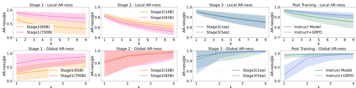 - AR-ness increases during later training stages (700B tokens) but performance drops, prompting selection of the 65B-token Stage 1 model as the base; mid-training and instruction tuning reduce AR-ness while improving performance.