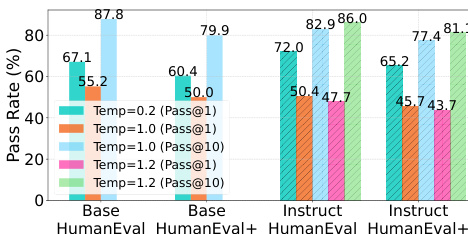 Results show that DiffuCoder-Instruct achieves competitive performance on HumanEval and MBPP benchmarks, with coupled GRPO improving pass@k scores across multiple metrics. The model's performance is further enhanced by increasing sampling temperature, which reduces AR-ness and enables more diverse and parallelizable generation.