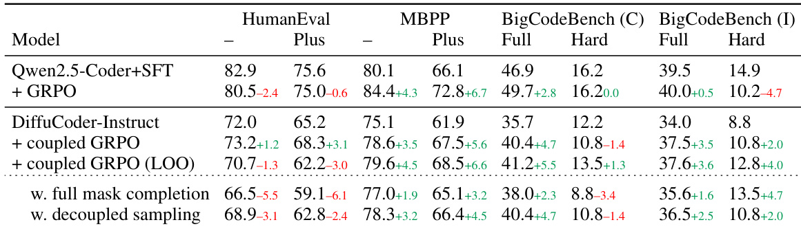 - We propose coupled-GRPO, a novel reinforcement learning method that uses paired complementary mask noise to reduce variance in policy gradient estimation, improving DiffuCoder’s EvalPlus score by 4.4% without relying on semi-AR decoding.
