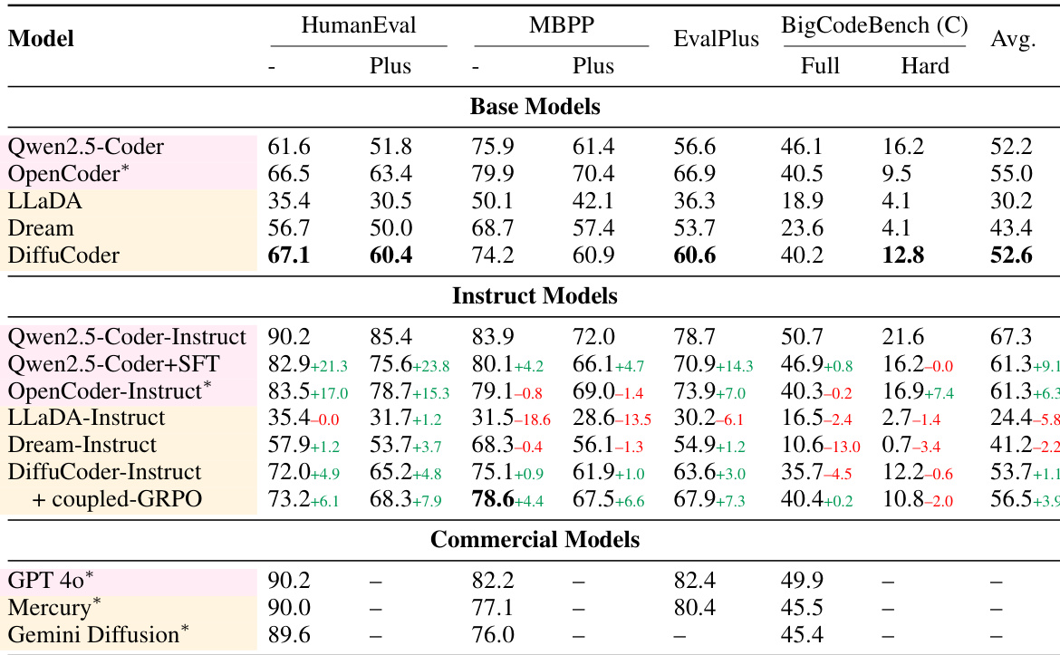 The authors use a table to compare the performance of various diffusion-based language models (dLLMs) and autoregressive (AR) models on coding benchmarks. Results show that DiffuCoder achieves the highest average score among base models, with a significant improvement over LLaDA and Dream, and that instruction tuning further boosts performance, particularly for DiffuCoder-Instruct, which outperforms other models on most tasks. The table also indicates that coupling GRPO training with instruction tuning leads to the best overall results, with DiffuCoder-Instruct + coupled-GRPO achieving the highest scores on HumanEval, MBPP, and BigCodeBench.