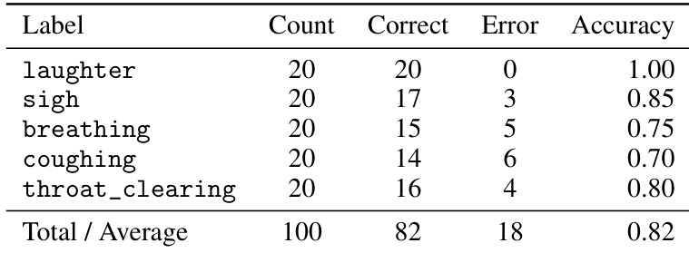 - Validated paralinguistic control: achieved 82% overall recognition accuracy for five paralinguistic events, with near-perfect control for and high fidelity for and <throat_clearing>, though lower accuracy for subtle events like (75%) and (70%).