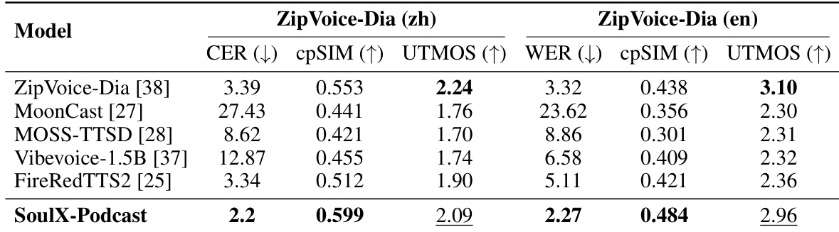 Results show that SoulX-Podcast outperforms existing multi-speaker TTS systems on the ZipVoice-Dia benchmark, achieving the lowest CER and WER while maintaining the highest cross-speaker consistency (cpSIM) and competitive UTMOS scores in both Chinese and English. This indicates superior performance in multi-turn dialogue generation with strong speaker coherence and high perceptual quality.