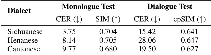 The authors evaluate SoulX-Podcast's performance on three Chinese dialects—Sichuanese, Henanese, and Cantonese—in both monologue and dialogue settings. Results show consistent speaker similarity across all dialects, with CER values indicating varying levels of intelligibility, where Sichuanese achieves the lowest CER in monologue synthesis and Cantonese shows the highest in dialogue synthesis.