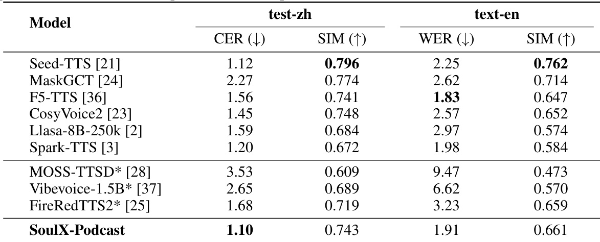 - Evaluated SoulX-Podcast on monologue speech synthesis: achieved lowest CER on Chinese test set and second-best WER on English test set in zero-shot TTS, with high speaker similarity ranking just behind Seed-TTS and MaskGCT on both languages.