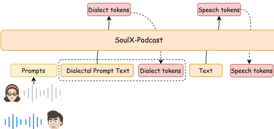 The authors leverage large language models (LLMs) and discrete speech tokenization to advance text-to-speech (TTS) synthesis, addressing a key gap in multi-speaker, long-form conversational speech generation. While prior TTS systems excel in single-speaker, monologue synthesis, they struggle with maintaining natural prosody, speaker consistency, and coherence across extended dialogues—especially in diverse linguistic contexts. Existing approaches for multi-speaker dialogue either lack fine-grained paralinguistic control or fail to support dialectal variation, limiting realism and personalization. To overcome these limitations, the authors introduce SoulX-Podcast, a unified framework that enables long-form, multi-turn podcast-style speech synthesis with support for Mandarin, English, and multiple Chinese dialects—including Sichuanese, Henanese, and Cantonese—while enabling cross-dialectal zero-shot voice cloning. The system models interleaved text-speech sequences with speaker labels and paralinguistic controls, ensuring stable speaker identity, context-aware prosody, and smooth transitions. It achieves state-of-the-art performance in both conversational synthesis and conventional TTS tasks, demonstrating robustness and versatility in generating over 90 minutes of natural, coherent dialogue.