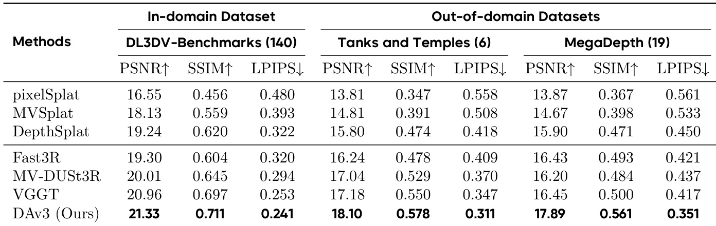 Results show that the proposed DA3 model achieves the best performance across all metrics and datasets, outperforming all baselines in both in-domain and out-of-domain benchmarks. On the DL3DV-Benchmarks, DA3 achieves the highest PSNR, SSIM, and LPIPS scores, and it also leads in all three metrics on Tanks and Temples and MegaDepth, demonstrating superior novel view synthesis quality.