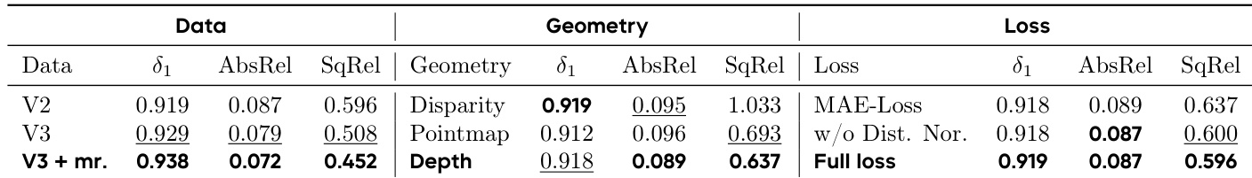 The authors evaluate the impact of different training data and loss configurations on monocular depth estimation. Results show that using V3 data with multi-resolution training (V3 + mr) achieves the best performance across all metrics, with a δ₁ of 0.938, AbsRel of 0.072, and SqRel of 0.452. The full loss, which includes the proposed normal-loss term, further improves performance compared to the MAE-Loss baseline, achieving a δ₁ of 0.919, AbsRel of 0.087, and SqRel of 0.596.