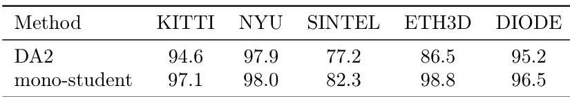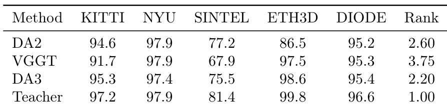 - Achieved strong monocular depth performance with the student model, improving over DA2 by over 10% on ETH3D and +5.1% on SINTEL, attributed to enhanced teacher supervision and scaled training data.