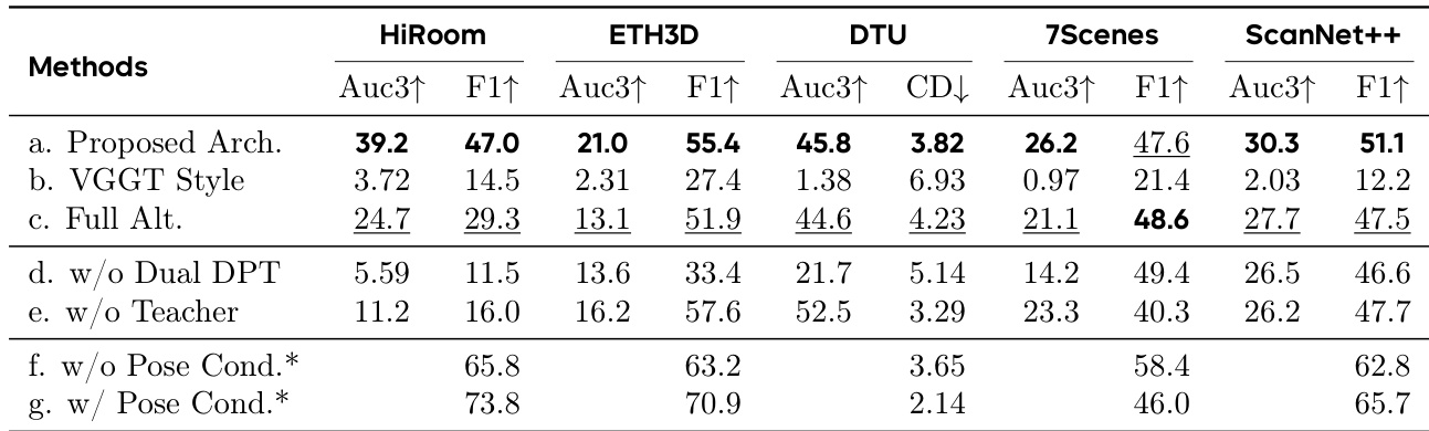 The authors evaluate the impact of different architectural and training components on geometry estimation performance. Results show that the proposed architecture significantly outperforms the VGGT-style and full alternation baselines across all datasets, with the best results achieved by the full model. Removing the dual-DPT head or teacher supervision leads to substantial performance drops, while adding pose conditioning further improves results, especially on datasets like HiRoom and ScanNet++.