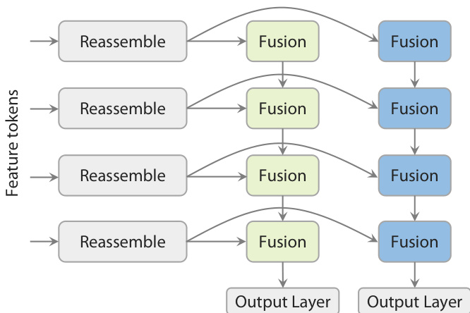 The final prediction stage employs a novel Dual-DPT head, which jointly generates dense depth and ray maps. As shown in the figure below, this head first processes the backbone features through a shared set of reassembly modules. The processed features are then fused using two distinct sets of fusion layers—one for the depth branch and one for the ray branch—before being passed to separate output layers. This architecture ensures that both prediction tasks operate on the same set of processed features, promoting strong interaction between them while avoiding redundant intermediate representations.