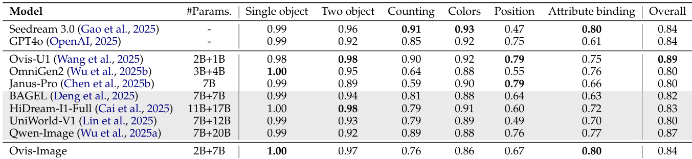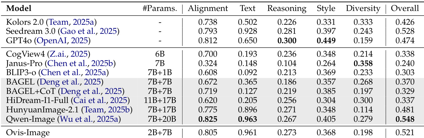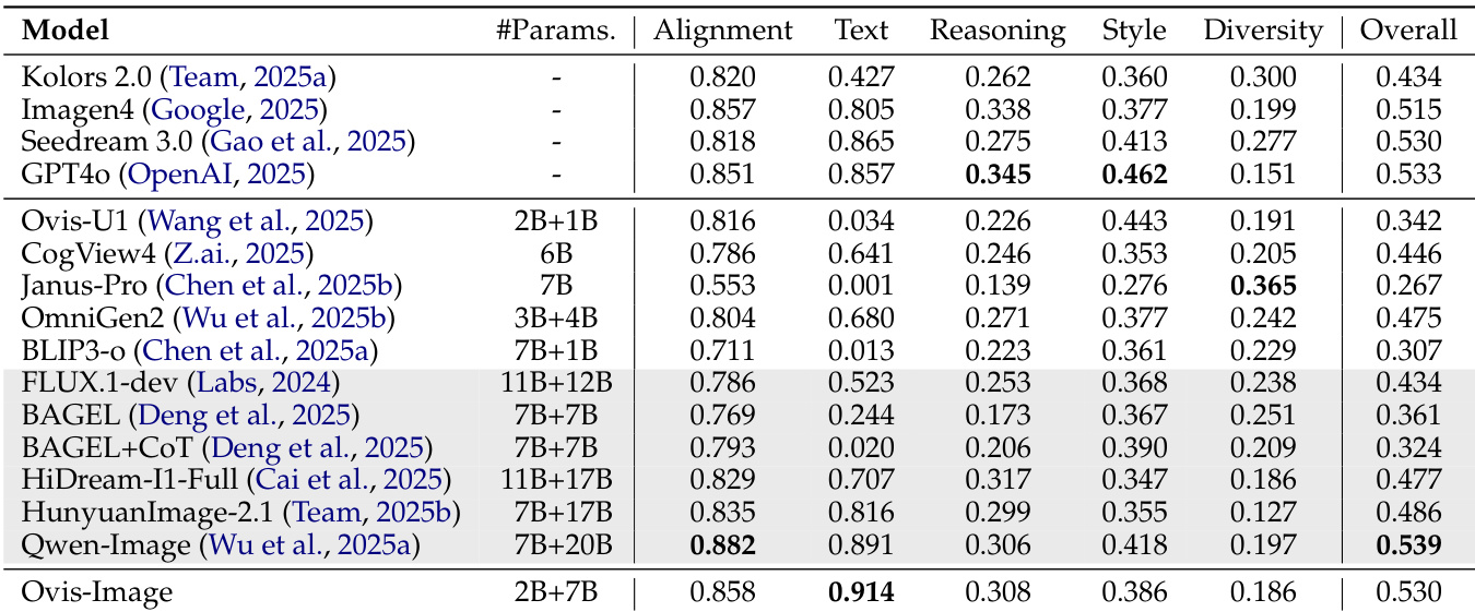 Results show that Ovis-Image achieves the highest overall score of 0.521, outperforming all other models across multiple evaluation dimensions including alignment, text rendering, and diversity. Despite having a smaller parameter count than several baselines, Ovis-Image demonstrates superior performance in text-related tasks, particularly in text rendering and bilingual generation, while maintaining a more efficient computational footprint.