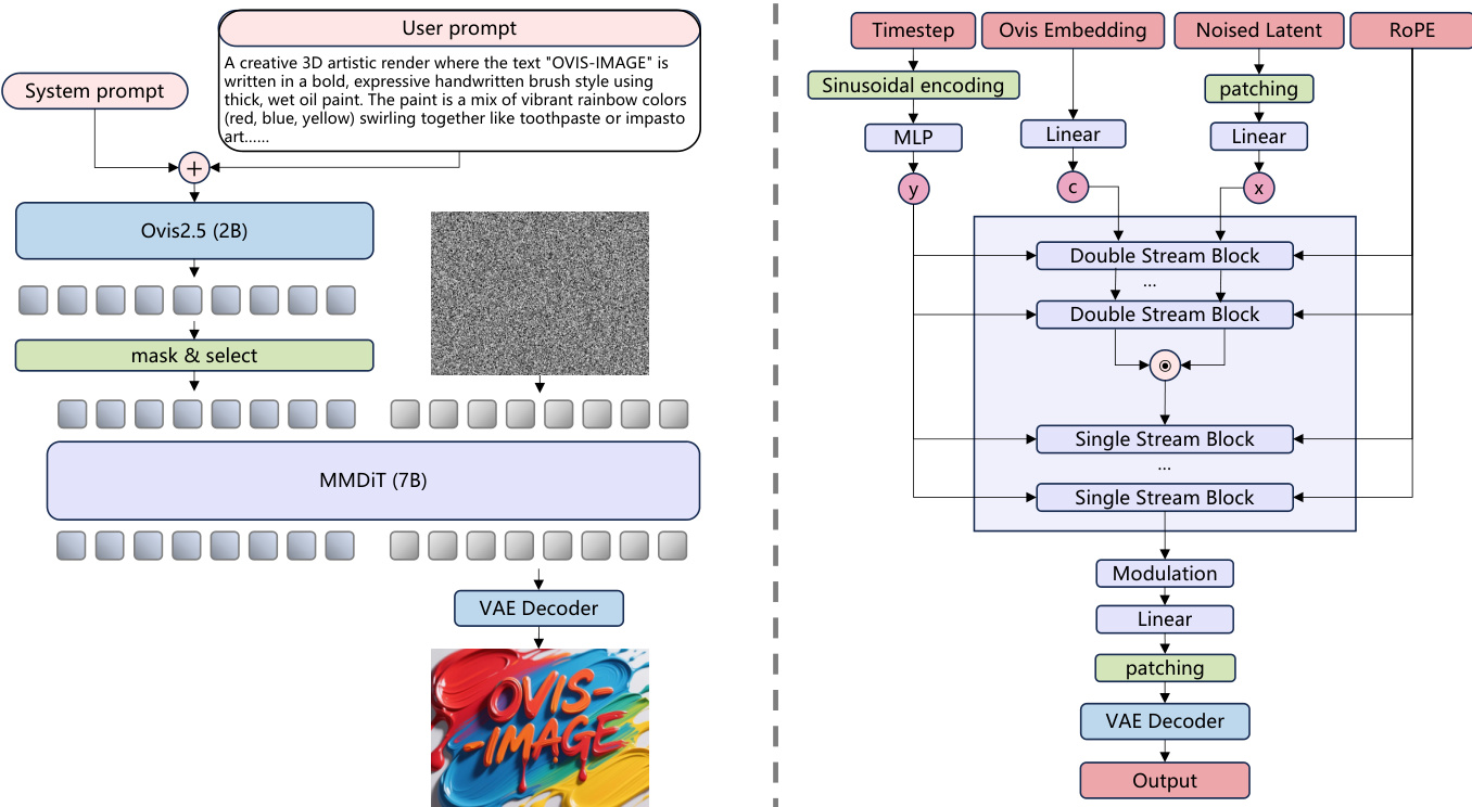 The architecture consists of a text encoder, a visual decoder, and a variational autoencoder (VAE) for latent space manipulation. The text encoder is based on the Ovis 2.5-2B model, which is specifically trained on multimodal data to ensure strong alignment between textual and visual representations. This encoder processes the user prompt and generates embeddings that condition the image generation process. Unlike the Ovis-U1 framework, Ovis-Image simplifies the architecture by removing the refiner structure and directly utilizing the final hidden states of the Ovis encoder as conditioning inputs for the image decoder.