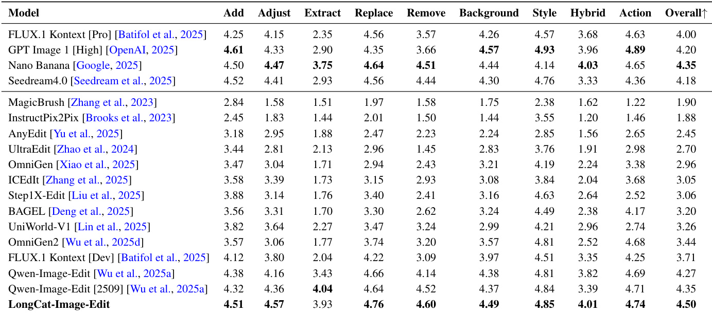 Results show that LongCat-Image-Edit achieves the highest overall score of 4.50 on the CEdit-Bench, outperforming all compared models including commercial systems like FLUX.1 Kontext [Pro] and Qwen-Image-Edit. The model demonstrates strong performance across all editing categories, particularly excelling in action, style, and hybrid editing tasks, with notable improvements in consistency and comprehensive quality.