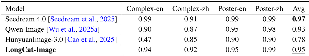 Results show that LongCat-Image achieves an average score of 0.95 across all evaluated benchmarks, outperforming HunyuanImage-3.0 and approaching the performance of Seedream 4.0, which achieves an average score of 0.97. The model demonstrates strong capabilities in both English and Chinese text rendering tasks, with particularly high scores on the Complex-en and Poster-zh subsets, indicating robust performance in handling complex textual content and bilingual scenarios.