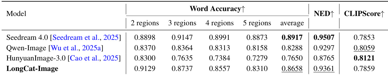 Results show that LongCat-Image achieves the highest average word accuracy of 0.8658, outperforming Seedream 4.0 and Qwen-Image, while also achieving a competitive NED score of 0.9361 and a CLIPScore of 0.7859. The model demonstrates strong performance in multi-region text rendering, particularly in handling complex text layouts, though it lags behind Seedream 4.0 in NED and Qwen-Image in CLIPScore.