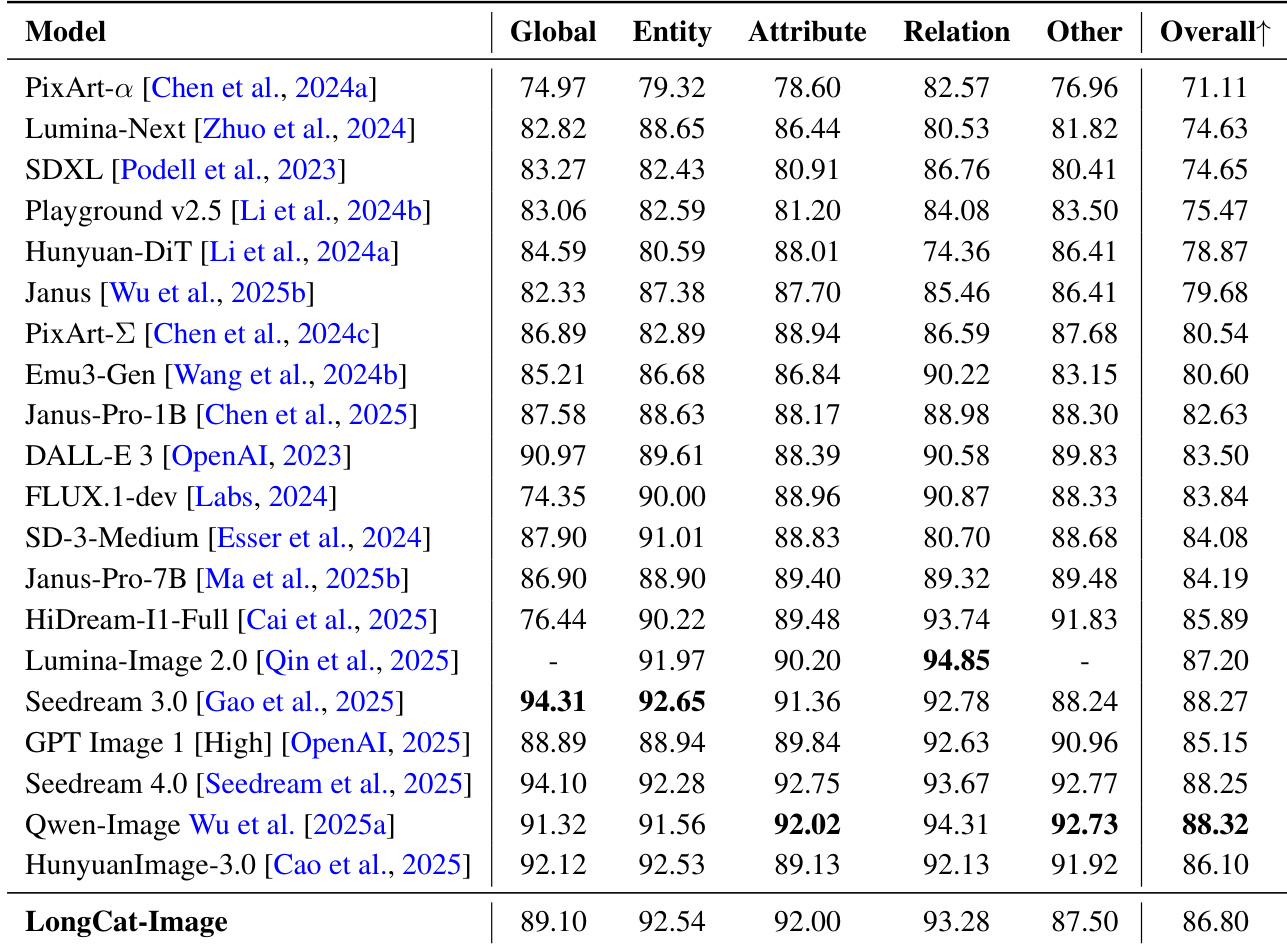 The authors use a comprehensive evaluation framework to assess LongCat-Image's performance across multiple dimensions, including text-image alignment, entity recognition, attribute binding, and relational reasoning. Results show that LongCat-Image achieves strong performance across all categories, with particularly high scores in entity and attribute tasks, and ranks among the top models in overall performance, demonstrating its robustness in handling complex compositional and semantic constraints.